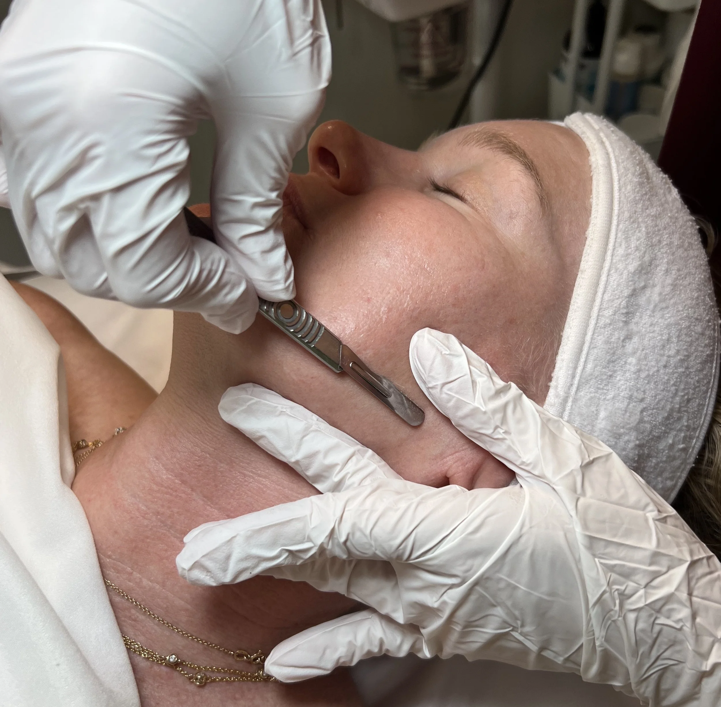 Dermaplaning + Gentle Custom Facial: This is one of our favorite combos pre-event! Dermaplaning removes peach fuzz and surface dead skin, so makeup goes on like a dream.